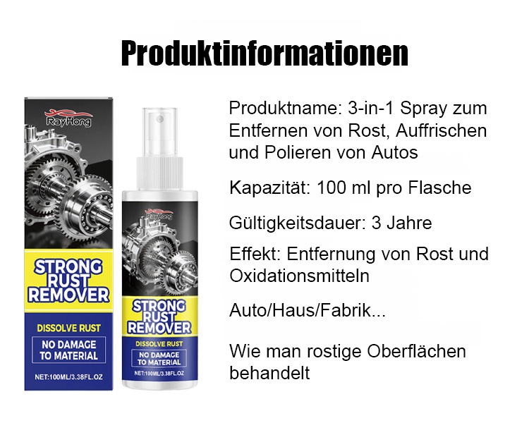 Auto Rostentferner + Reparatur + Politur 3-in-1 Spray🔥 Haben Sie genug von hässlichen Rostflecken an Ihrem Auto? Mit nur einem Sprühstoß verschwindet der Rost in wenigen Minuten.